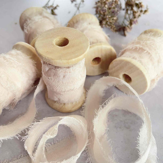 Our silk ribbons are made from the finest Habatoi Silk and dyed with natural dyes resulting in a superior finish. Our raw edge silk ribbons come with a hand frayed edge. Each 5 metre length comes perfectly presented on a wooden reel.